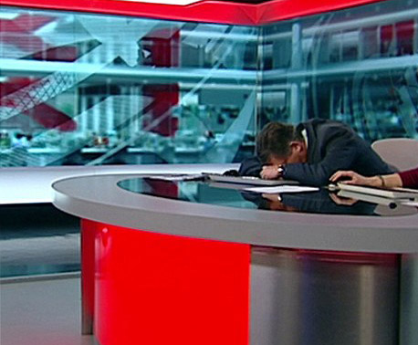 جاءت اللقطة الساعة الثامنة و26 دقيقة، عندما التقطت الكاميرات المذيع خلال استراحة وهو مسترخى على المكتب قبل أن يفيق من غفوته فى لقطة غير متوقعة على الكاميرات. وظهر المذيع وهو نائم على المكتب قبل لحظات من دخوله مع زميلته مارتين كروكسل على الهواء.