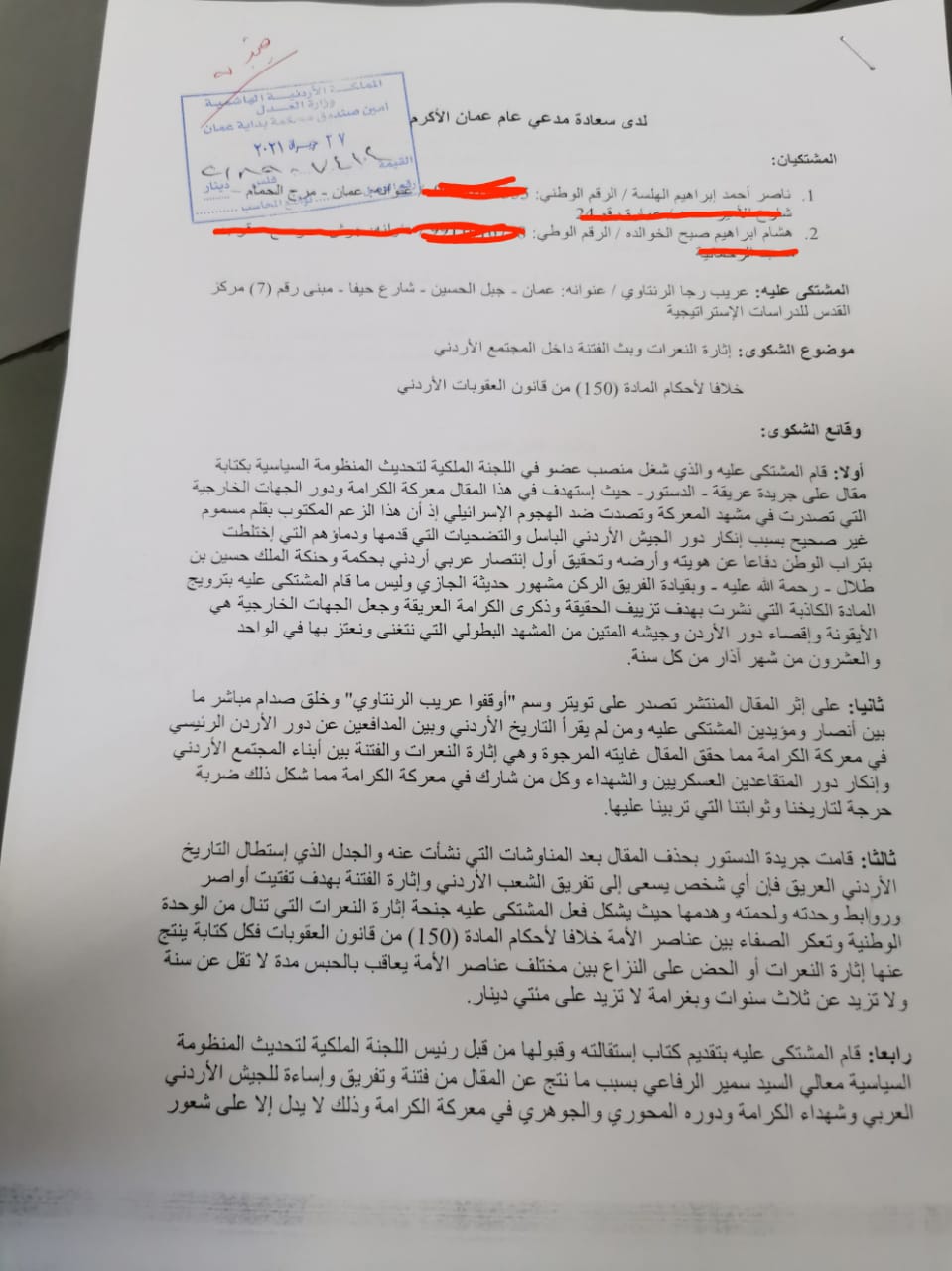 جفرا نيوز - تقدّم مجموعة من الشباب صباح اليوم الأحد بشكوى لدى مدعي عام عمان الأول على خلفية قضية العضو المستقيل من اللجنة الملكية لتحديث المنظومة السياسية عريب الرنتاوي، وما أثاره مقاله الأخير .
