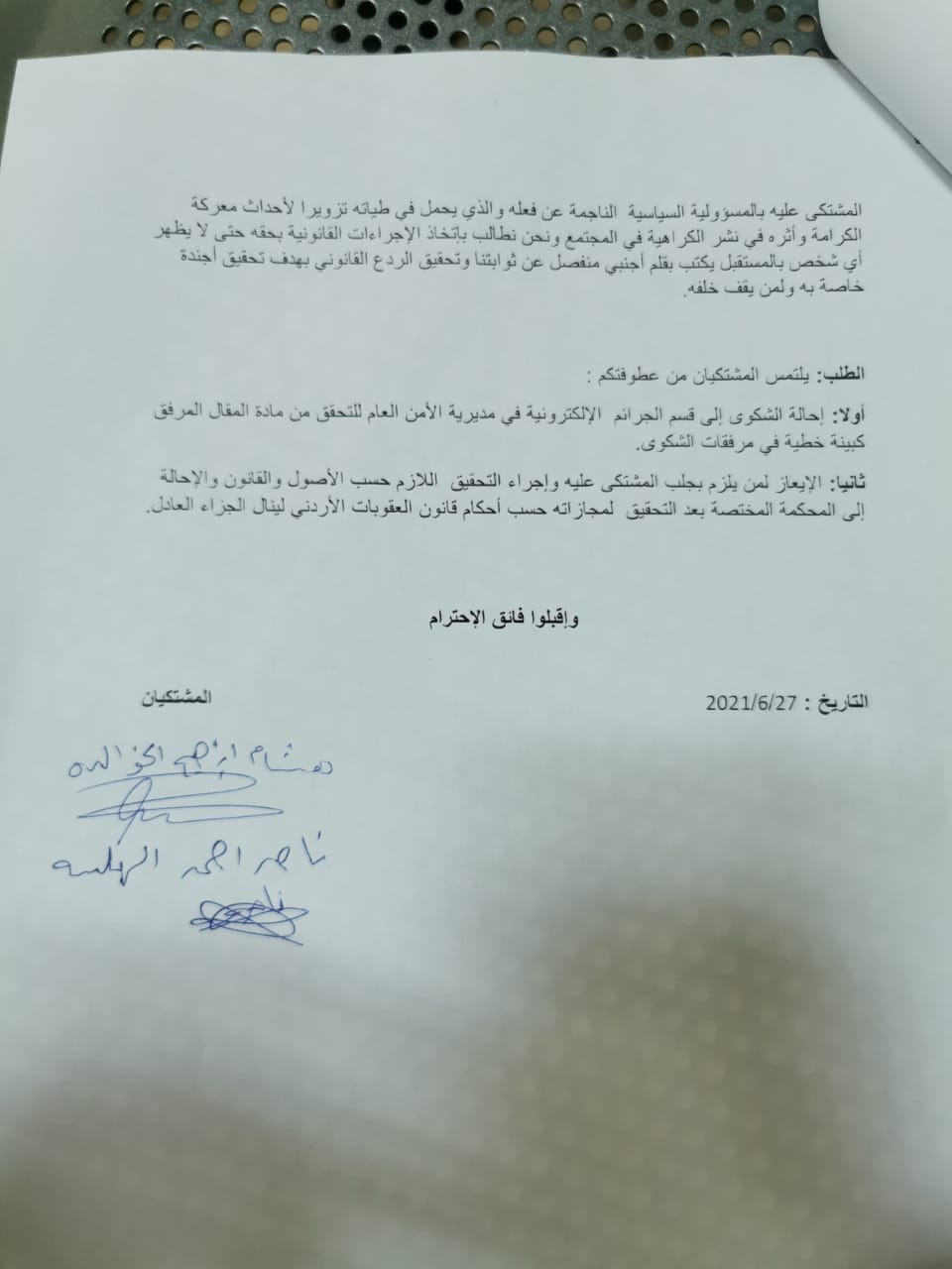 تأسست الشكوى قانونيا على أساس ارتكاب جنحة إثارة النعرات بهدف النيل من الوحدة الوطنية وتعكير الصفاء بين عناصر الأمة خلافا لأحكام المادة (150) من قانون العقوبات، الذي ينص على أن كل كتابة ينتج عنها إثارة النعرات أو الحض على النزاع بين مختلف عناصر الأمة يعاقب بالحبس مدة لا تقل عن سنة ولا تزيد عن ثلاث سنوات وبغرامة لا تزيد على مئتي دينار.