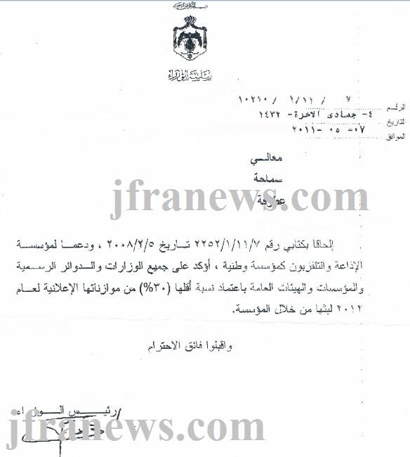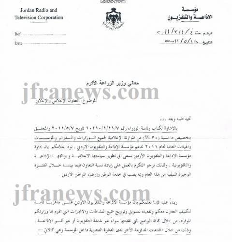 وللعلم فان جميع الوزارات والدوائر الرسمية والمؤسسات العامة تعتمد نسبة اقلها (30%) من موازنتها الاعلانية لبثها من خلال التلفزيون الاردني وتاليا الوثائق التي حصلت جفرا نيوز عليها :