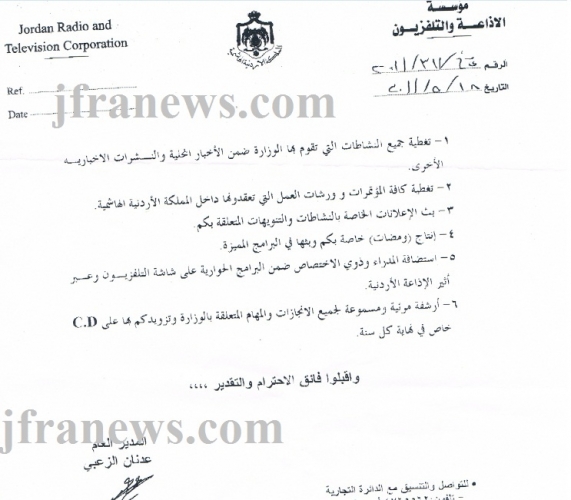 التلفزيون الاردني يطلب من الوزارات ان تدفع مقابل بث اخبار الوزارات والدوائر الحكومية من خلال الخدمات المدفوعة الاجر لدى الدائرة التجارية .