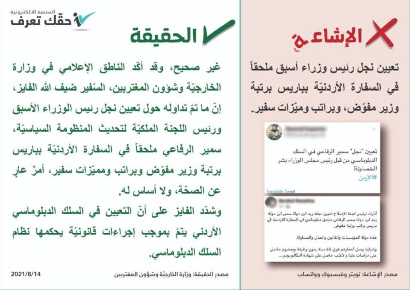 الحكومة: لا صحّة لتعيين نجل رئيس الوزراء الأسبق سمير الرفاعي ملحقاً في السفارة الأردنيّة بباريس
