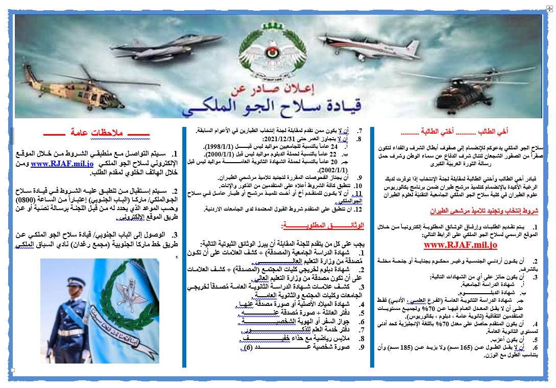 2. سيتم إستقبال من تنطبق عليه الشروط في قيادة سلاح الجوالملكي/ ماركا (الباب الجنوبي) إعتباراً من الساعة (0800) وحسب الموعد الذي يحدد له من قبل اللجنة برسالة نصَية أو عن طريق الموقع الإلكتروني .