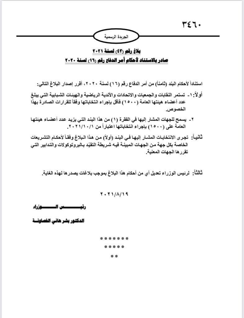 وبموجب البلاغ، تستمرّ النّقابات، والجمعيّات، والاتحادات والأندية الرياضيّة، والهيئات الشبابيّة، التي يبلغ عدد أعضاء هيئتها العامّة (1500) عضو فأقلّ بإجراء انتخاباتها وفقاً للقرارات الصّادرة سابقاً بهذا الخصوص.