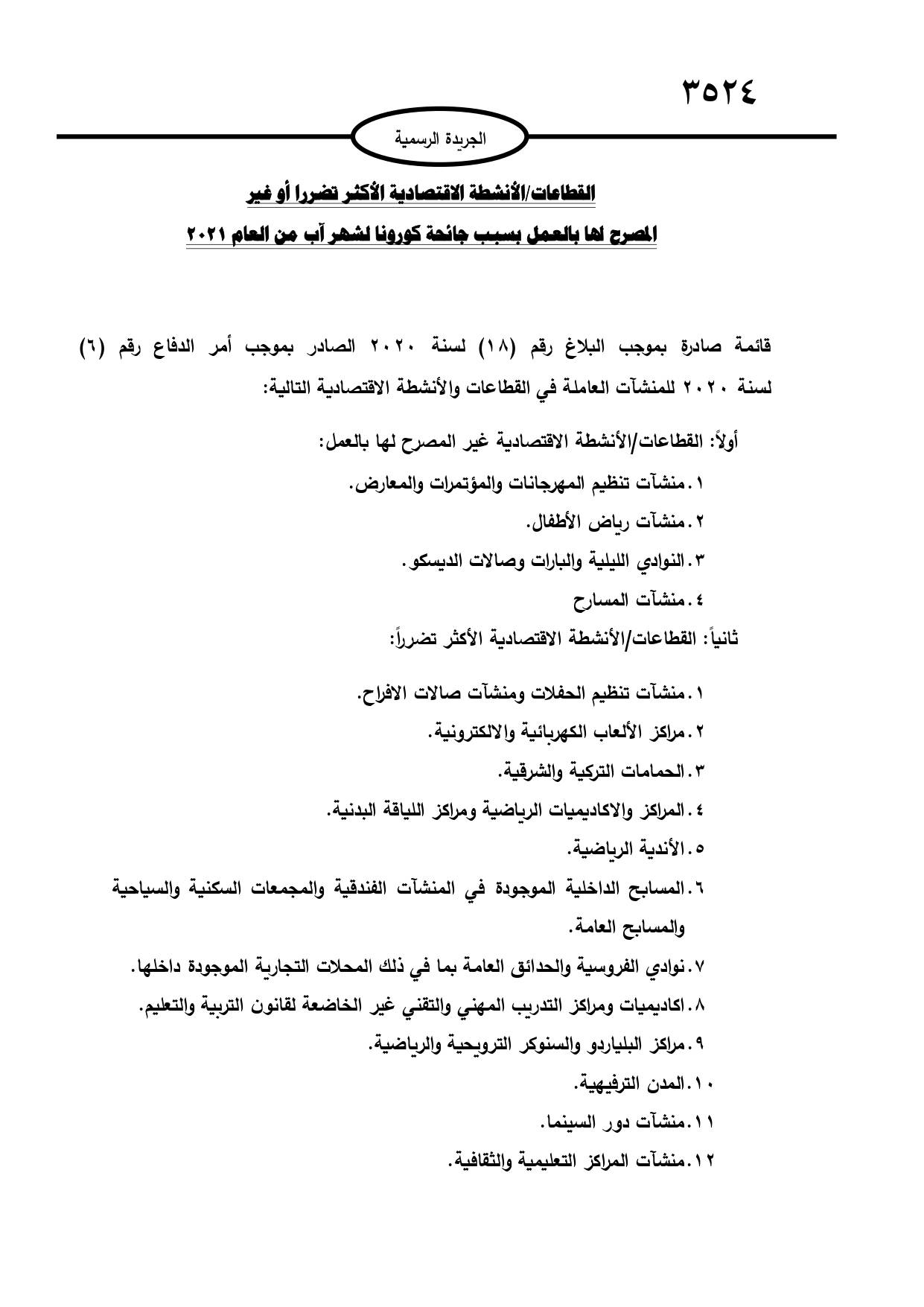 جفرا نيوز - نشر في الجريدة الرسمية، اليوم الأربعاء، قائمة القطاعات/ الأنشطة الأكثر تضررا بسبب جائحة كورونا لشهر آب من العام 2021.