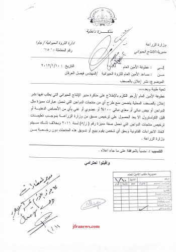 حذرت وزارة الزراعة منع طرح اي من منتجات الدواجن وبيض المائدة و التي تحمل عبارات دعائية مثل "الدجاج المميز" أو "بيض نباتي" أو "مغذي نباتي 100% " أو "عضوي" أو "غني بأي من الاحماض الدهنية" و"قليل الكوليسترول"، وغير ذلك من عبارات دعائية تكتب فوق عبوات المنتج الا بعد الحصول على ترخيص مسبق من الوزارة بموجب تعليمات ترخيص منتجات الدواجن التي تحمل صفة مميزة رقم ( ز/5) لسنة 2011 وبخلاف ذلك سيتم اتخاذ الاجراءات القانونية وبحق أي شخص يقوم ببيع أو تسويق هذه المنتجات دون رخصة من الوزارة