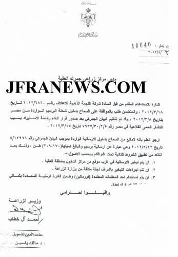 وجاء في كتاب ارسله وزير الزراعة احمد ال خطاب الى مدير مركز زراعي جمرك العقبة " اشارة للاستدعاء المقدم من قبل السادة شركة النجمة الذهبية للاعلاف رقم 6860/2012 تاريخ 18/3/2012 ، والمتضمن بالموافقة على السماح بدخول شحنة البرسيم الواردة من مصر بتاريخ 18/3/2012 وقد تم تنظيم البان الجمركي بعد صدور قرار الغاء رخصة الاستيراد بسبب انتشار الحمى القلاعية في مصر رقم 5/2/30 / 79737 تاريخ 15/3/2012.