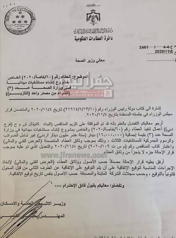 جفرا نيوز - كشفت وثائق رسمية أن إحالة عطاءات المستشفيات الميدانية الثلاثة المستحدثة مؤخرا لاجل التصدي لجائحة كورونا تمت بطريقة التلزيم على احدى الشركات في "دبي" بقيمة بلغت نحو 16 مليون دينار