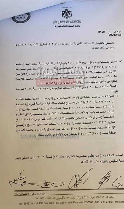 العطاء تم تلزيمه بموجب كتاب صادر عن رئيس الوزراء تحت رقم 10/13/1/ 21614 تاريخ 14/11/2020 عطاء رقم 10 /خاصة /2020 حيث بيّنت الوثائق أن العطاء تم دون طرح مناقصة أو الاعلان عنه حسب الأصول، وتم تلزيمه للشركة نفسها بالقيمة المشار اليها.