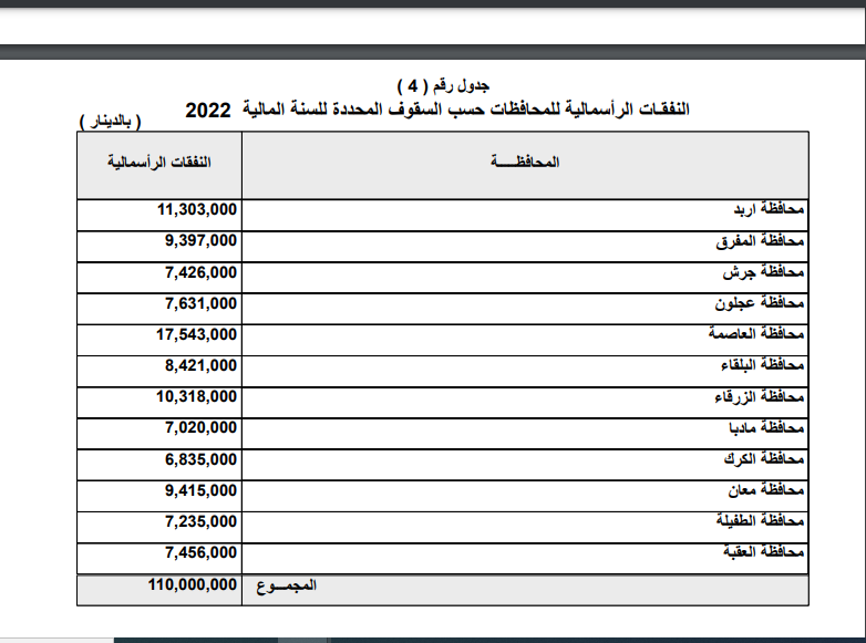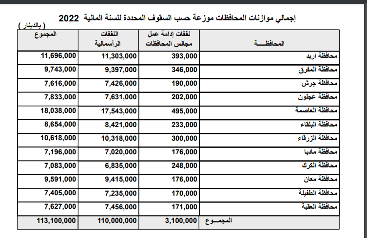 تكشف الارقام بالموازنة العامة بالعام الحالي 2022 انها رصدت للمحافظات ، حوالى 110 مليون اكثرها ، وفق التدقيق بالارقام من ـ خارج محافظة العاصمةــ كانت حصة محافظة اربد الاعلى (11 ) مليون دينار ، واقلها محافظة الكرك ( 7 ) مليون ، دققوا في الارقام وهناك (مرفق جدول)