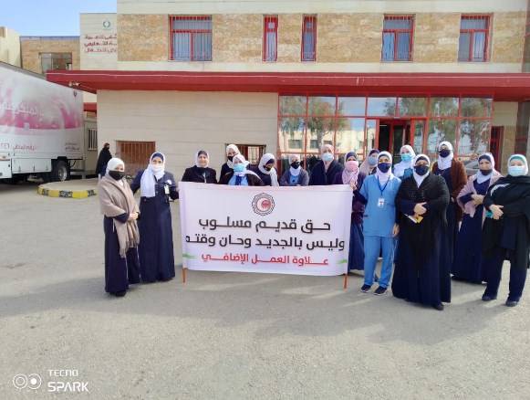 جفرا نيوز - نفذت نقاية الممرضين اليوم وقفات احتجاجية للممرضين العاملين في مستشفيات وزارة الصحة ومراكزها الصحية، للمطالبة برفع علاوة العمل الاضافي من 30% الى 35% من الراتب الاجمالي اسوة بباقي المهن الصحية في الوزارة.