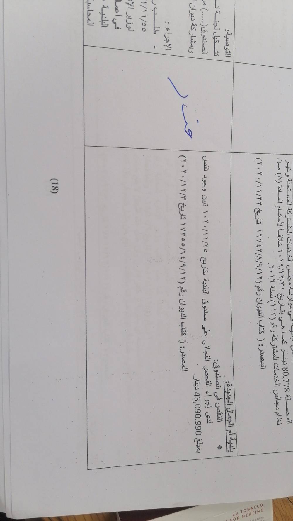 وكشف تقرير ديوان المحاسبة لعام 2020، انه ولدى تدقيق اجراء الفحص الفجائي على صندوق البلدية بتاريخ 25/11/2020، تبين وجود نقص بمبلغ 43,090,990 دينار