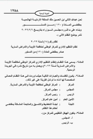 جفرا نيوز - صدرت الإرادة الملكية السامية بوضع نظام التنظيم الإداري للمركز الوطني لمكافحة الأوبئة والأمراض السارية وبناء على ماقرره مجلس الوزراء ، وفقاً لما ورد في الجريدة الرسمية اليوم .