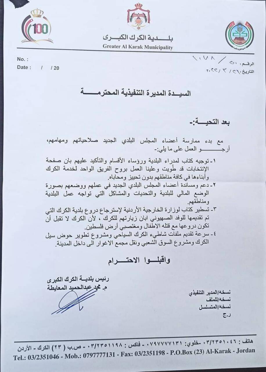 وفي كتاب موجه من رئيس البلدية الجديد المهندس محمد عبد الحميد المعايطة للمديرة التنفيذية طالب فيه ضرورة مخاطبة وزارة الخارجية لإستعادة الدروع التذكارية.