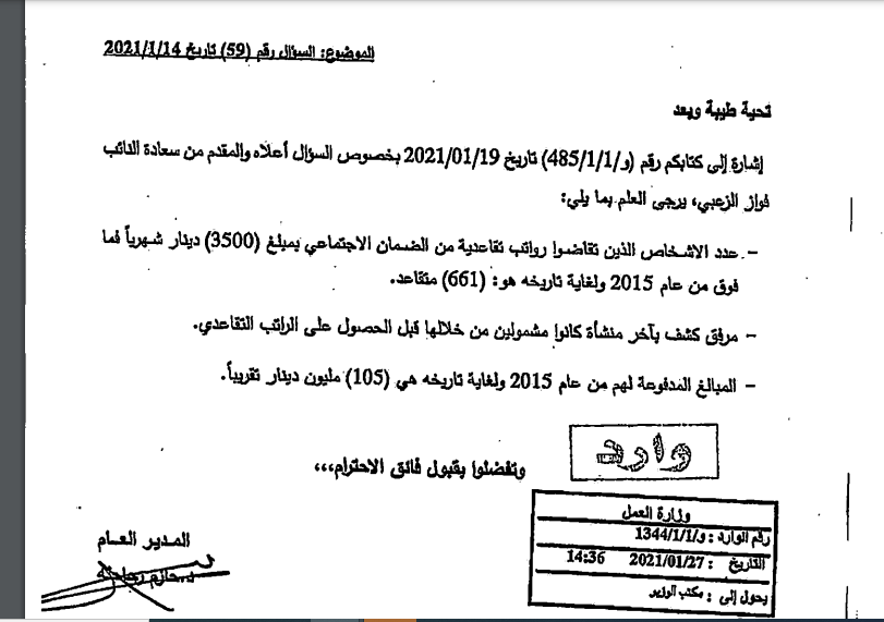 661 متقاعداً يتقاضون رواتب تزيد عن 3500 دينار .. والضمان دفع لهم 105 مليون منذ 7 سنوات