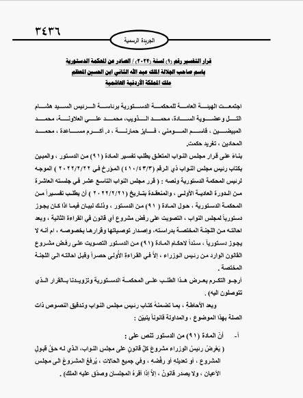 وطالب مجلس النواب المحكمة الدستورية تفسير المادة "91 من الدستور " إذا كان يجوز دستورياً لمجلس النواب التصويت على رفض مشروع أي قانون في القراءة الثانية وبعد احالته من اللجنة المختصة بدراسته واصدار توصياتها وقراراها بخصوصه، بعدم جواز دستورياً رفض النواب مشروع القانون خلال القراءة الثانية.