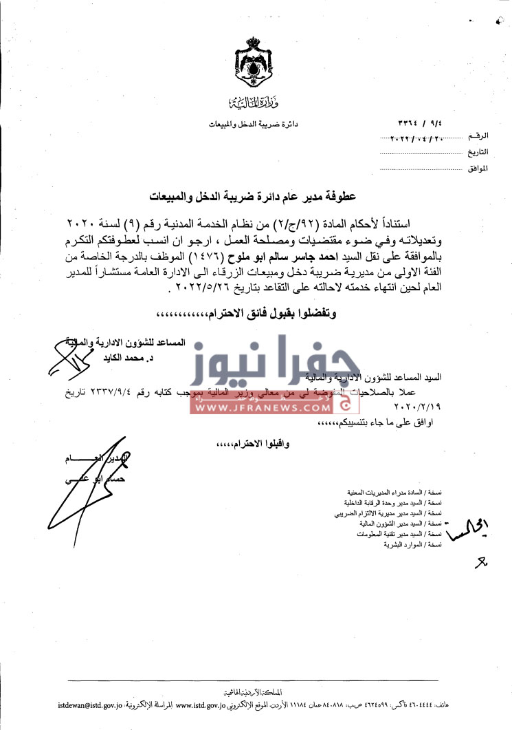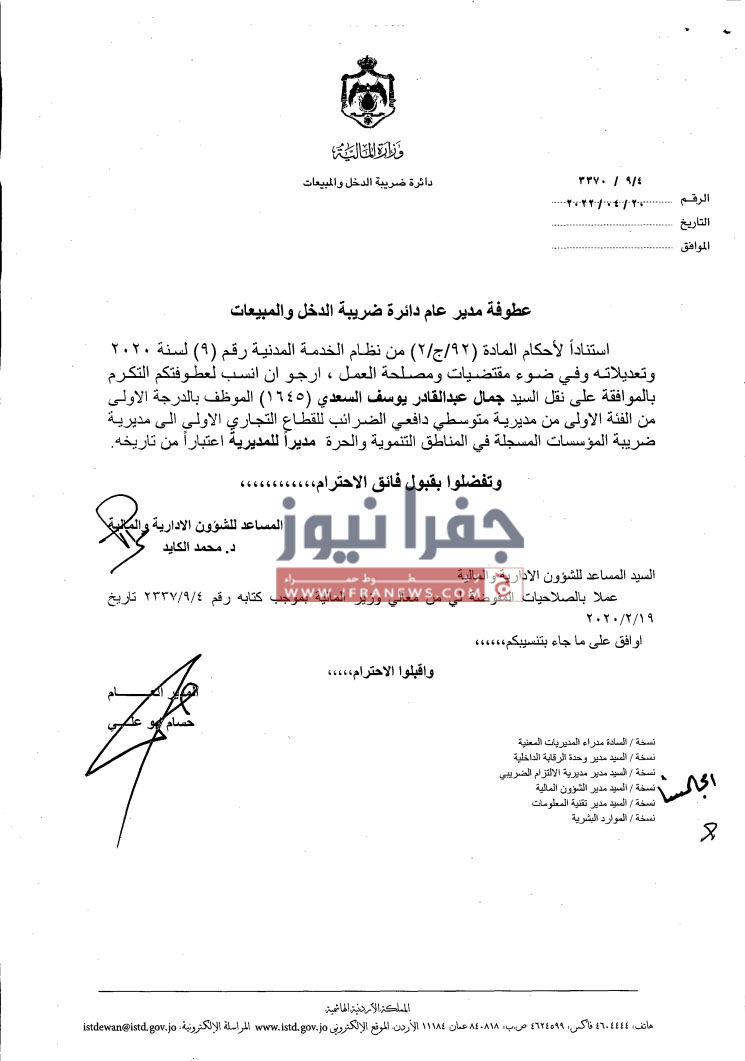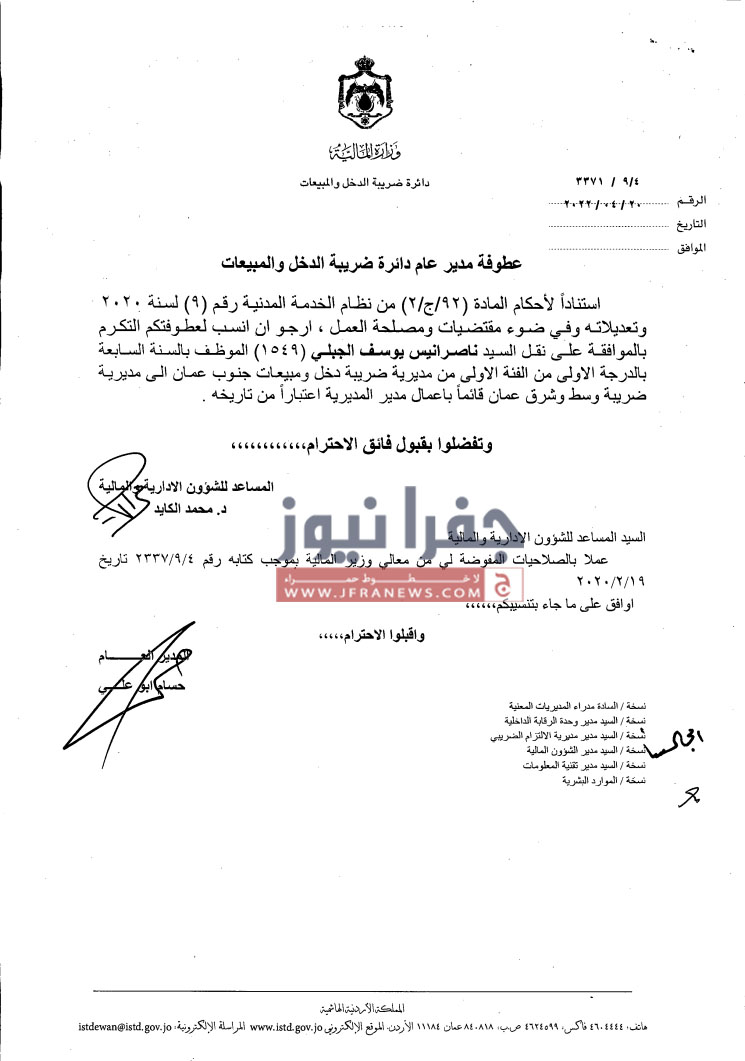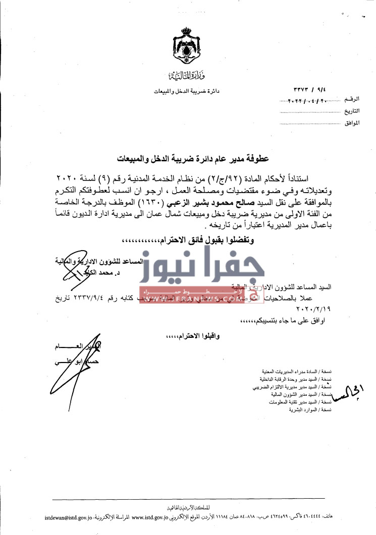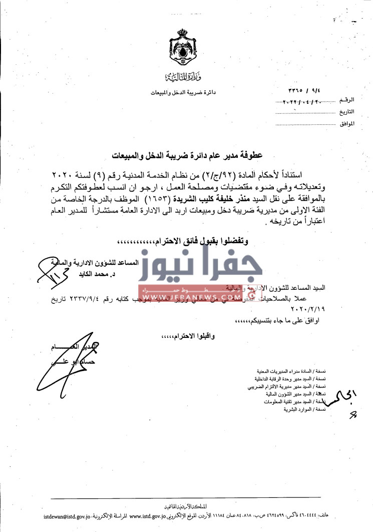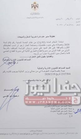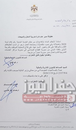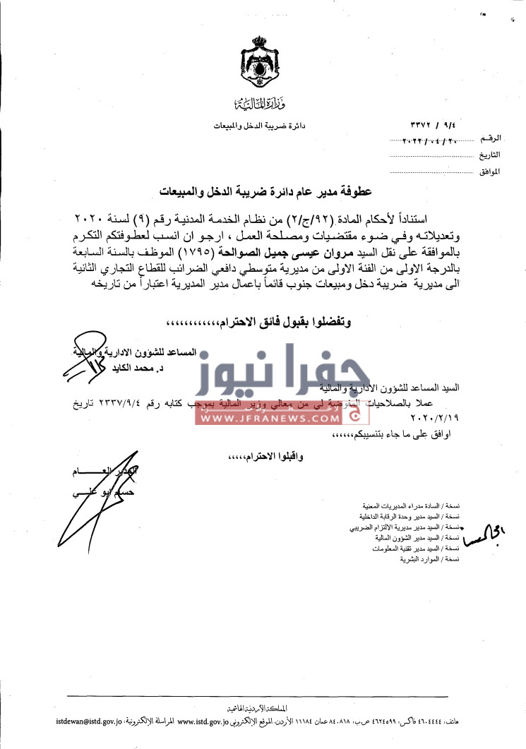 جفرا نيوز- أجرى مدير دائرة ضريبة الدخل والمبيعات حسام ابو علي،الخميس، تشكيلات إدارية وتنقلات شملت عدداً من الموظفين في عددٍ من المديريات.