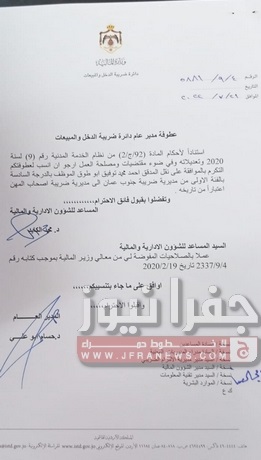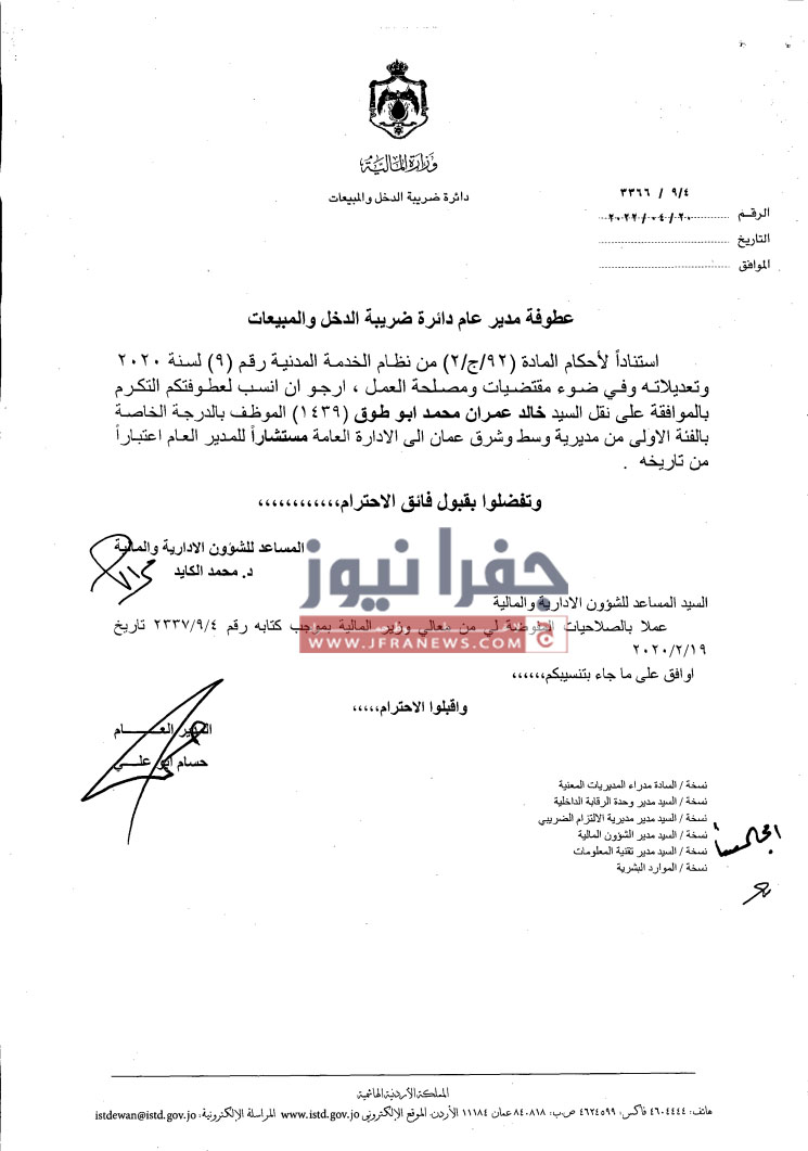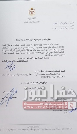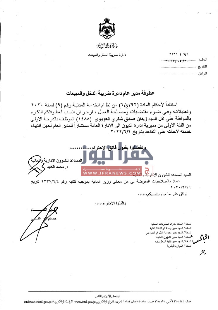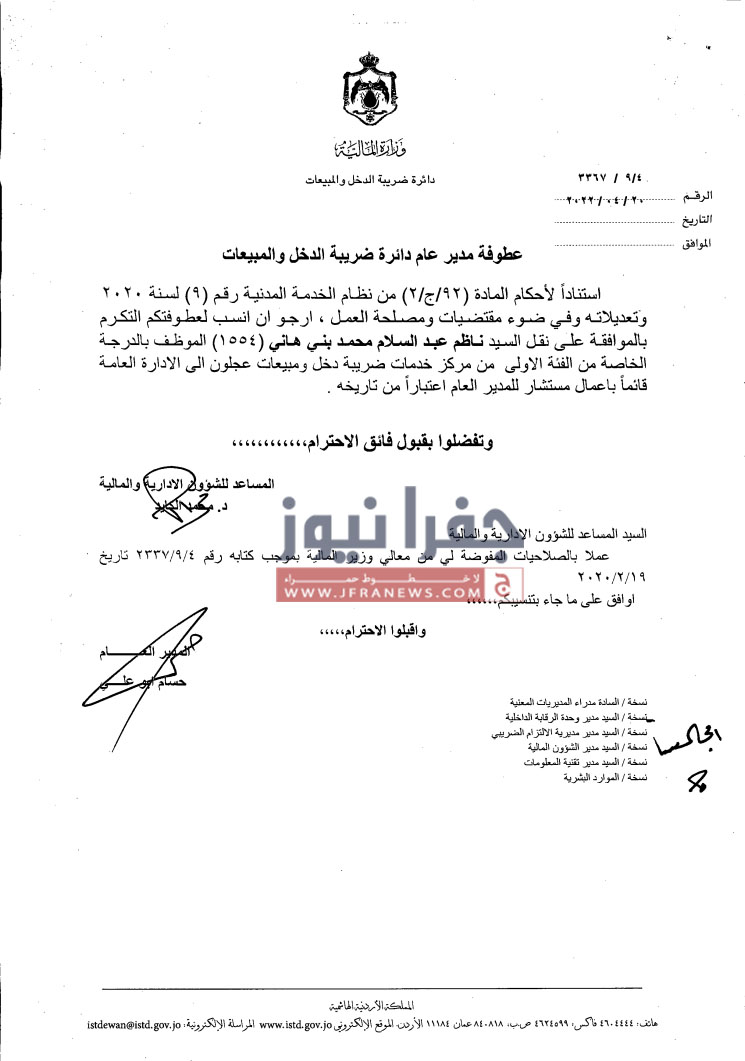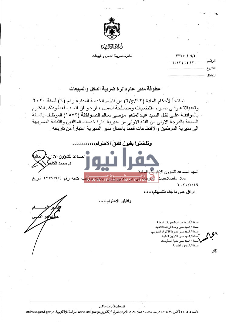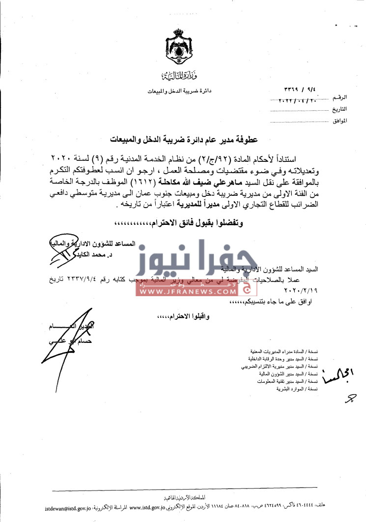 جفرا نيوز- أجرى مدير دائرة ضريبة الدخل والمبيعات حسام ابو علي،الخميس، تشكيلات إدارية وتنقلات شملت عدداً من الموظفين في عددٍ من المديريات.