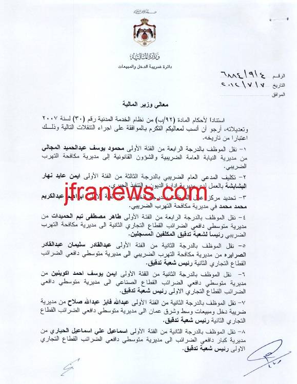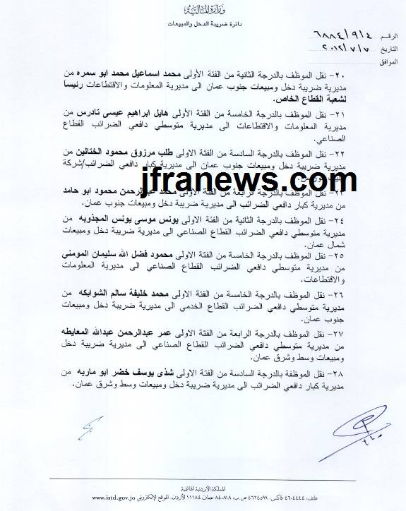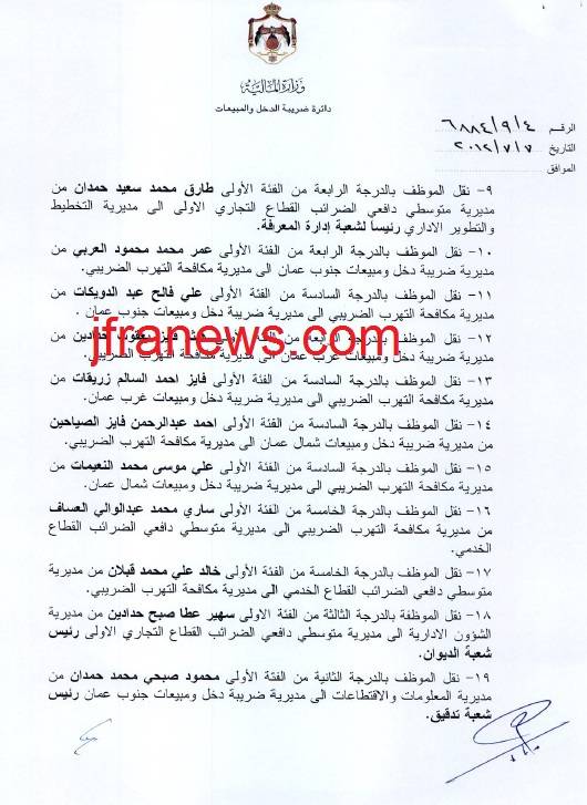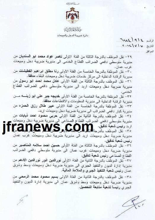 جفرا نيوز تنفرد بنشر تنقلات واسعه في دائرة ضريبة الدخل والمبيعات" اسماء