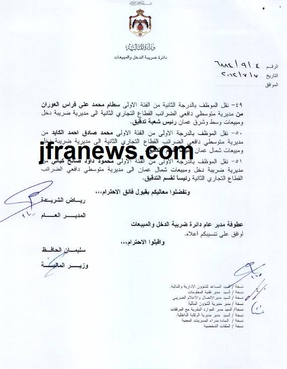 وافق وزير الماليه السيد سليمان الحافظ على تنسيبات السيد رياض الشريده مدير عام دائرة ضريبة الدخل والمبيعات باجراء تنقلات بين عدد من موظفي الفئة الاولى في الدائره شملت عدد من المديريات