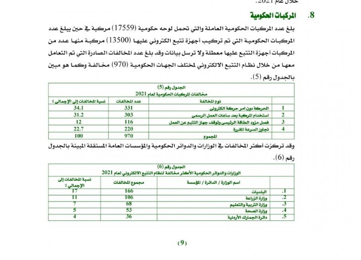وقد تركزت أكثر المخالفات لنظام التتبع الالكتروني لعام 2021 ، في الوزارات والدوائر الحكومية والمؤسسات العامة المستقلة ، حيث كان على رأسها البلديات ، وزارة الزراعة، والتربية والتعليم، وزارة الصحة ، دائرة الجمارك العامة .