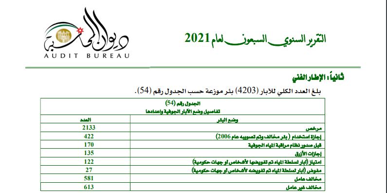 جفرا نيوز - أظهر تقرير ديوان المحاسبة عن استنزاف المياه الجوفية تخطت حدود الاستخراح الامن من خلال اللآبار غير المرخصة التي شهدت ارتفاعاً كبيراً.