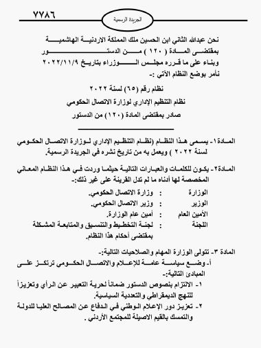 جفرا نيوز - أقر مجلس الوزراء نظام التنظيم الإداري لوزارة الاتصال الحكومي لسنة 2022 ، والتي ستتولى وضع سياسة عامة للإعلام والاتصال الحكومي .