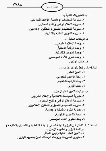 و يتضمن نظام التنظيم الإداري لوزارة الاتصال الحكومي لسنة 2022 ، ووفق الجريدة الرسمية وجود اربع مديريات ووحدات ، إلى جانب تشكيل لجنة في الوزارة تسمى ( لجنة التخطيط والتنسيق والمتابعة ) برئاسة الوزير وعضوية كل من الأمين العام نائبا لرئيس اللجنة ، ومديري المديريات ورؤساء الوحدات الذين يسميهم الوزير .