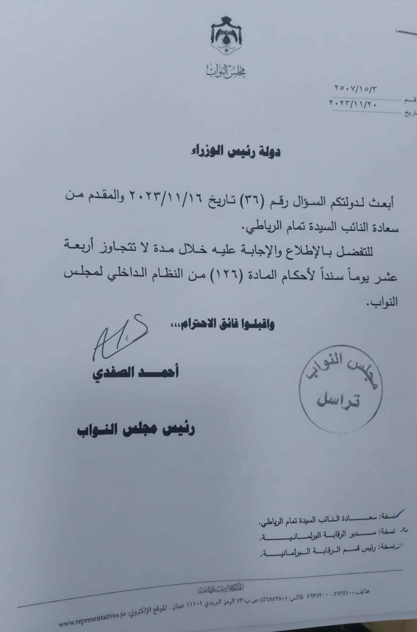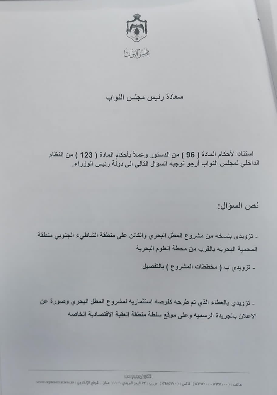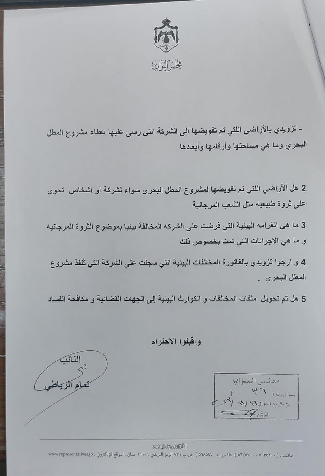 جفرا نيوز - وجهت النائب تمام الرياطي مجموعة من الأسئلة إلى رئيس الوزراء الدكتور بشر الخصاونة حول الأراضي التي تم تفوضيها لشركات أو أشخاص في مشروع المطل البحري بمفوضية العقبة خلال السنوات الأخيرة.