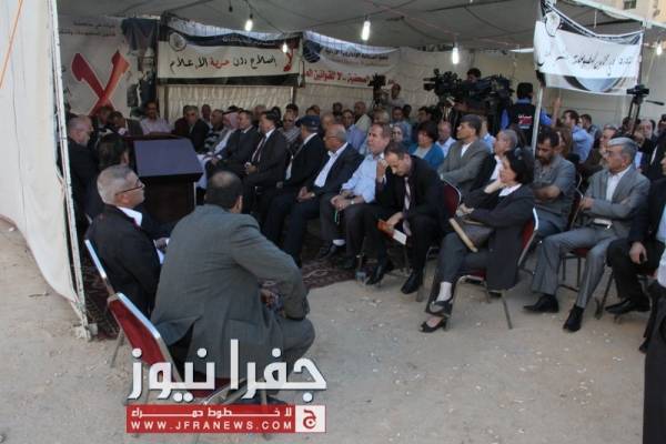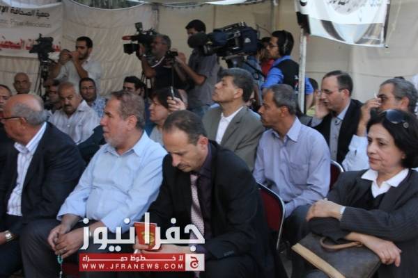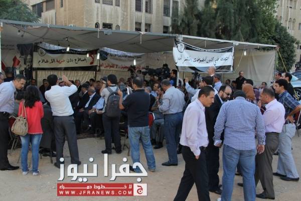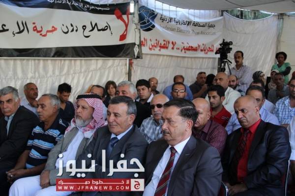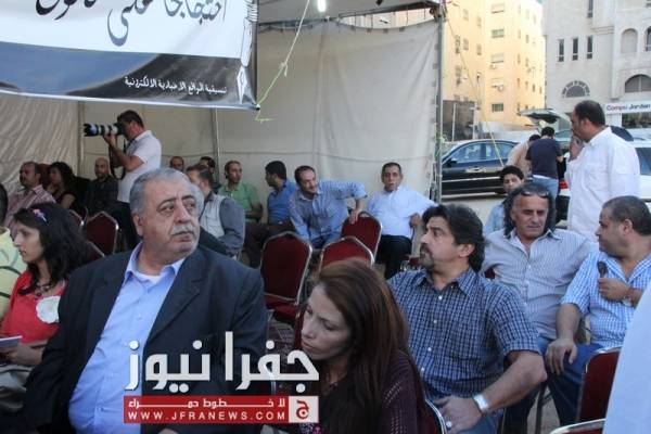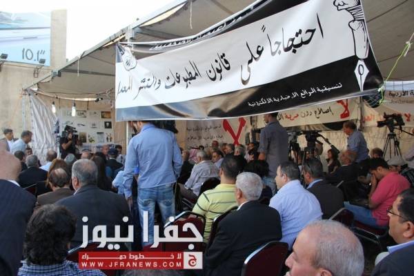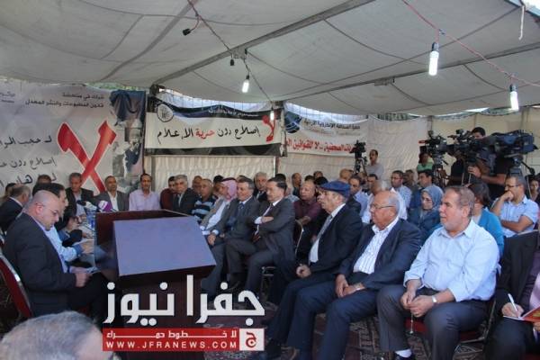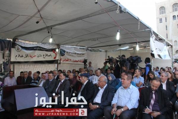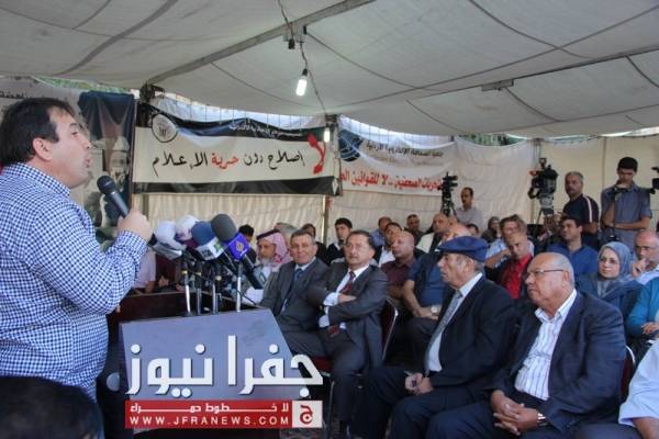 توافد العشرات من نشطاء الحقل العام، وممثلي القوى السياسية والنقابات المهنية والعمالية الى خيمة اعتصام الصحفيين مساء الاحد للمشاركة في المؤتمر الصحفي لإشهار التحالف المدني لمناهضة قانون المطبوعات .