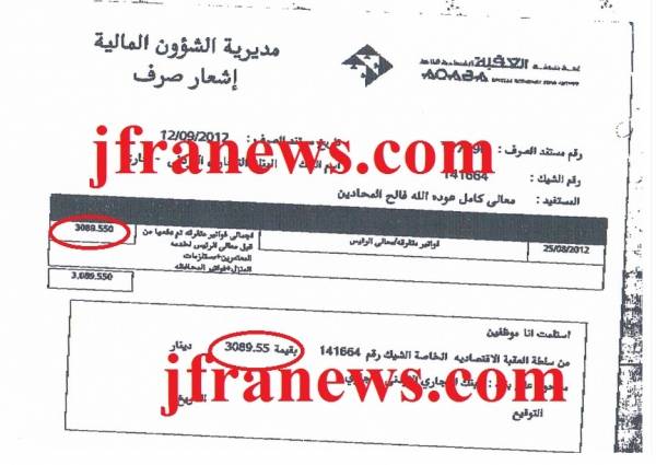 كما حصلنا على صورة اخرى لشيك نقدي قيمته تتجاوز الثلاث الاف دينار لم يعرف لحد الان غايات صرفها وكان مال الدولة اصبح تركة للسيد محادين.