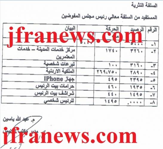 "جفرا ينوز" بدورها تنشر لكم اليوم احدى فواتير مصاريف الرئيس كامل محادين تحتوي على ثمن هاتف محمول من نوع" اي فون " بقيمة 495 دينار بالاضافة الى ثمن حرامات و شراشف لبيت الرئيس كما هو موضح امامكم و مصاريف شخصية بقيمة 1495 دينار.