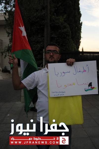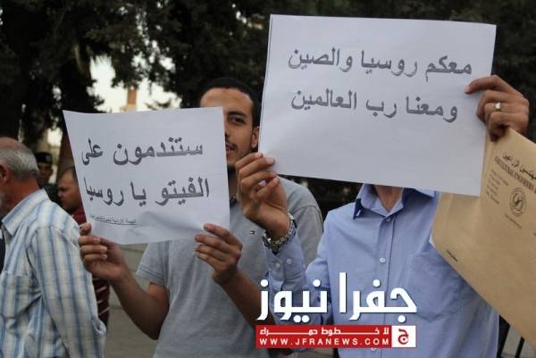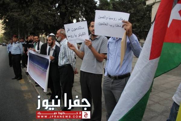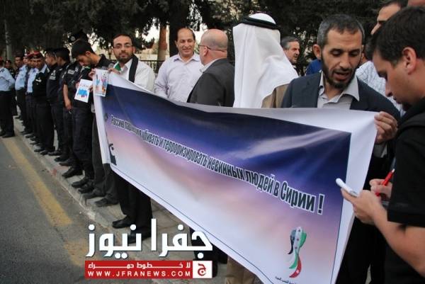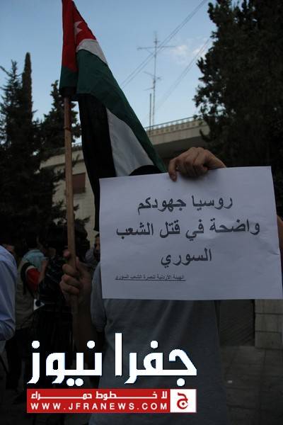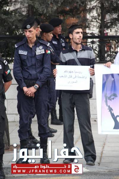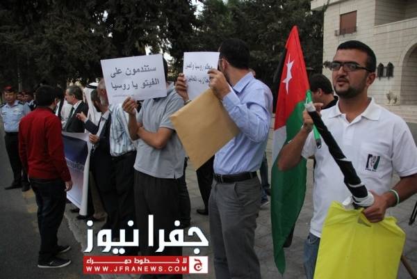 جفرا نيوز - جفرا نيوز - احمد براهمة - نفذ عدد من النشطاء وقفة احتجاجية مساء الاثنين امام السفارة الروسية بعمان ، بدعوة من الهيئة الاردنية لنصرة الشعب السوري وذلك احتجاجا على زيارة وزير الخارجية الروسي "سيرغي لافروف" للاردن، وتنديدا بالموقف الروسي تجاه الأزمة السورية.
