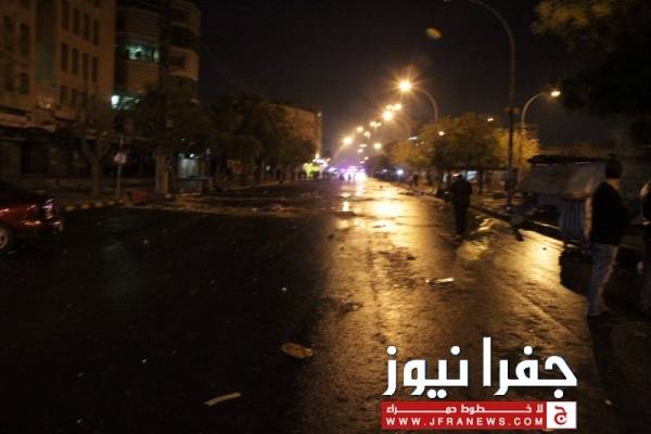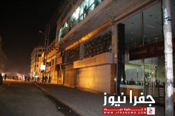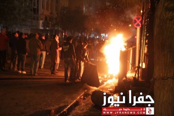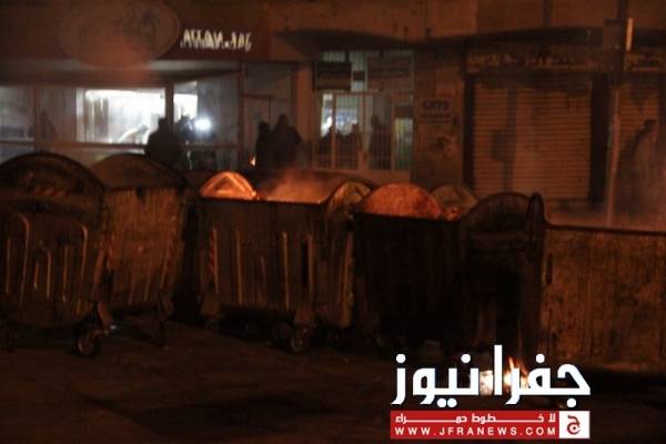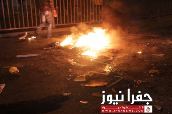 وقام المتظاهرون باغلاق الطريق الرئيسي بحاويات القمامة بعد احراقها، ووضع الحجارة في الطرقات،واحرقوا الاطارات، وقاموا بتكسير واجهات المحلات التجارية في المنطقة ،وامتلأت سماء المنطقة بسحب الغاز المسيل للدموع.