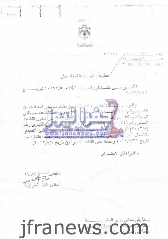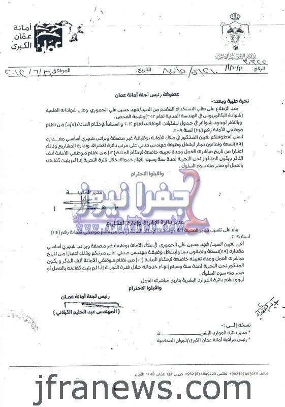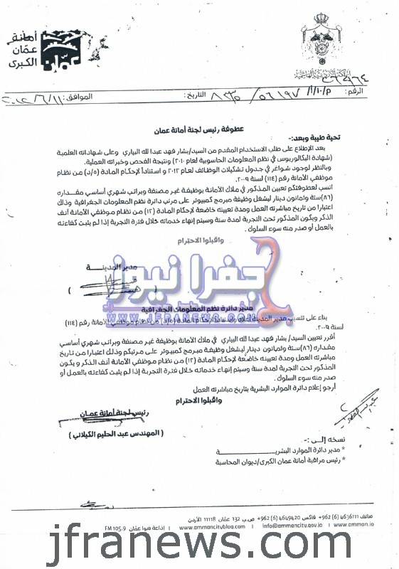 حطت على مكاتب "جفرا نيوز" رسالة بعث بها موظفون في أمانة عمان الكبرى، عبروا خلالها عن سخطهم الشديد إزاء العقلية التي يدير بها المهندس عبدالحليم الكيلاني قطاعهم العريض والذي لايمكن بحال من الأحوال أن يدار بمنطق الفزعات أو المشيخات، وهو ما يفعله الرجل الذي بات جليا انه يستقوي بتاريخ والده في ظل انعدام خبراته المهنية اللازمة، وعدم تحقيقه لأية إضافة تذكر، وانشغاله بالواسطات والمحسوبيات في فترة دقيقة وحساسة من مسيرة الوطن، فترة لاتستوعب مزيدا من الاستفزاز والكيل بمكيالين، وكأنه يحكم بأمره متجاهلا هدير الشارع وهيكلة الأمانة التي أنفقت عليها الملايين، والتوجيهات العليا للدولة بتقليص وترشيق الكوادر العمومية، على حد وصفهم.