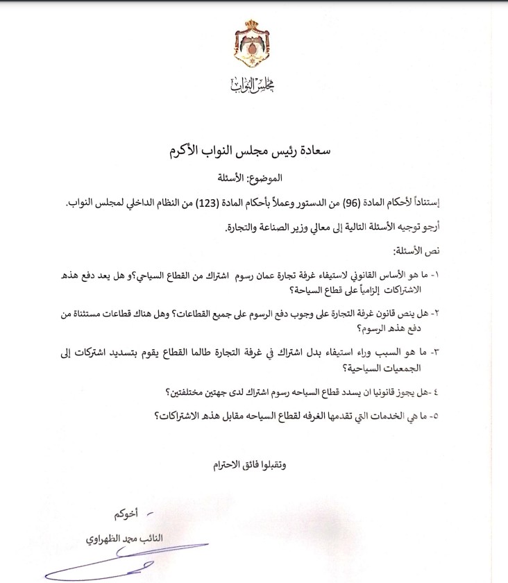 إستناداً لأحكام المادة (96) من الدستور وعملاً بأحكام المادة (123) من النظام الداخلي لمجلس النواب وجه النائب محمد الظهراوي مجموعة من الاسئلة النيابية الى وزير الصناعة والتجارة يعرب القضاة وتاليا نص الاسئلة :