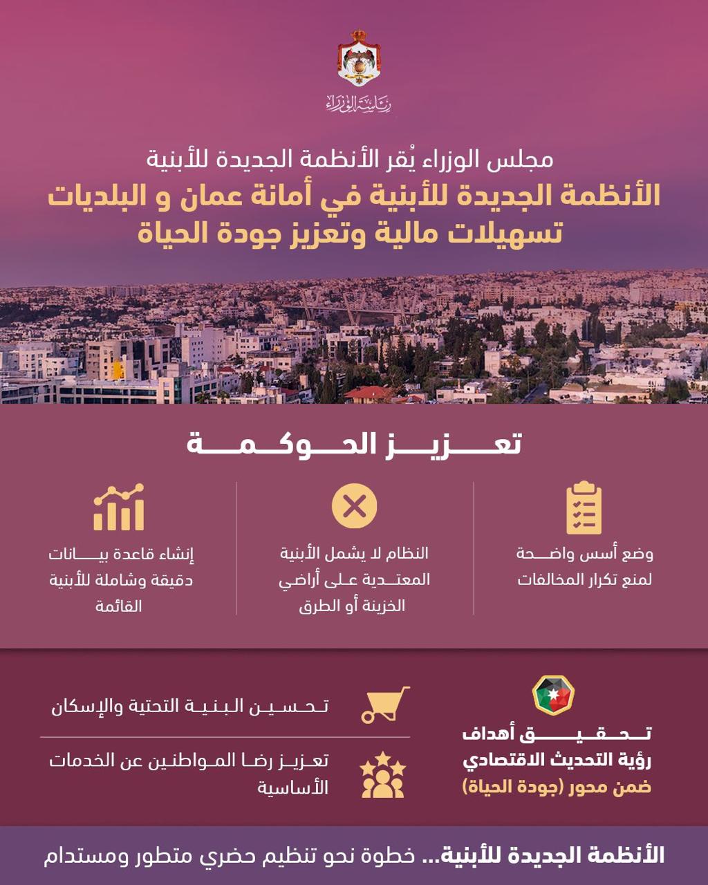 أقر مجلس الوزراء الأربعاء، نظاما معدلا لنظام الأبنية وتنظيم المدن والقُرى لسنة 2025م، ونظاما معدلا لنظام الأبنية والتنظيم في مدينة عمّان لسنة 2025م، لتقديم حلول شاملة ومعالجة القضايا العالقة منذ سنوات لآلاف المواطنين.