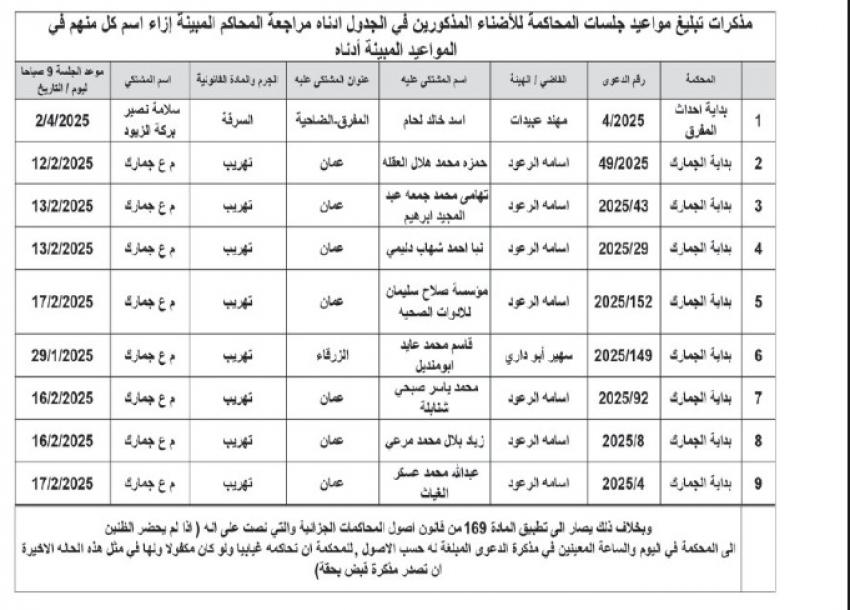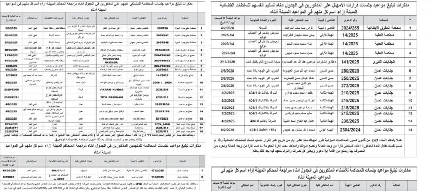 صدرت اليوم الاثنين، مذكرات تبليغ مواعيد جلسات المحاكمة لمشتكى عليهم ولمتهمين وقرارات امهال لحضور جلسات محاكمة.