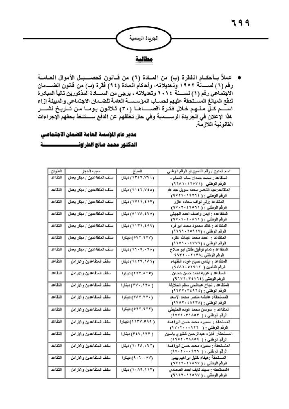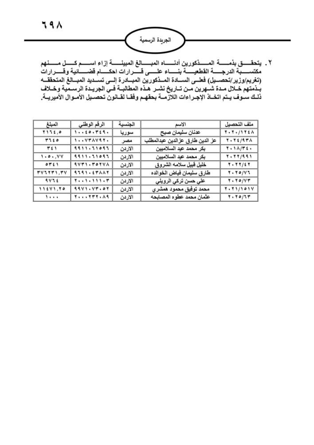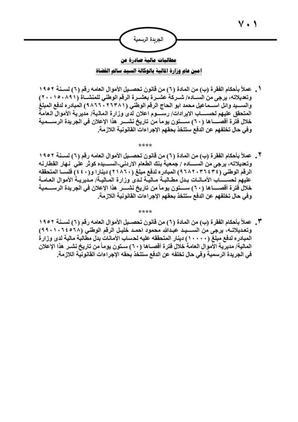 صدرت الأحد في الجريدة الرسمية مطالبات على مئات الاردنيين والشركات.