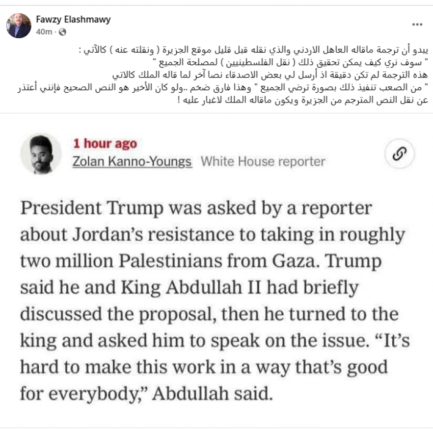 اعتذر مساعد وزير الخارجية المصري الأسبق السفير فوزي العشماوي عن خطأ في الترجمة للتصريحات التي ادلى بها الملك عبد الله الثاني في المؤتمر الصحفي الذي جمعه بالرئيس الأميركي دونالد ترمب.