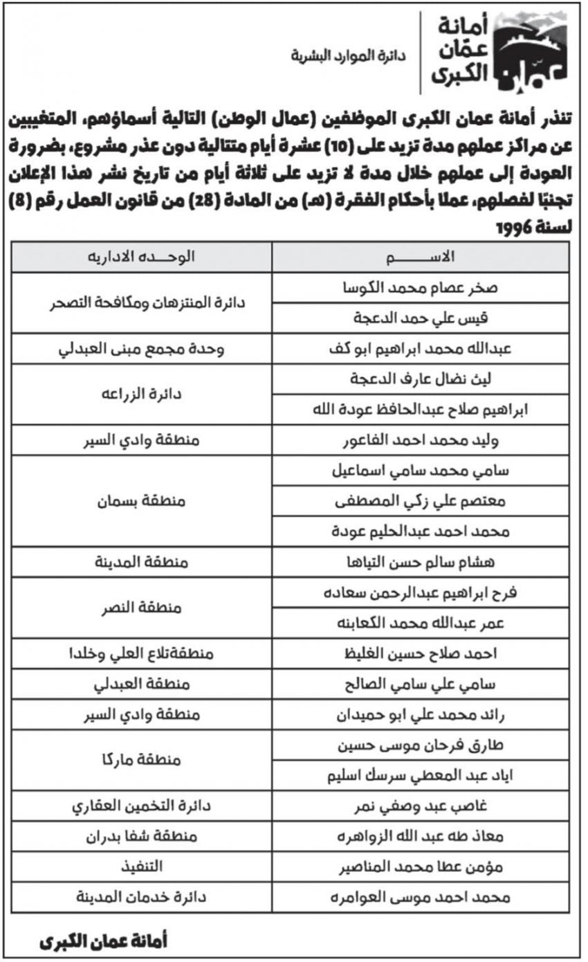 أنذرت أمانة عمان موظفين وعمال وطن بالفصل نظرا لتغيبهم عن عملهم مدة تزيد عن 10 أيام متتالية .