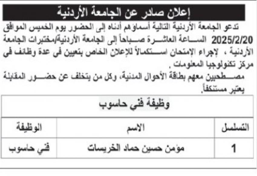 دعت دوائر حكومية بالتنسيق مع إدارة تقييم الكفايات الوظيفية/ هيئة الخدمة والادارة العامة ،الأربعاء، المرشحين التالية اسماؤهم لغايات اجراء الامتحان التنافسي الالكتروني يوم الخميس الموافق 27-2-2025.