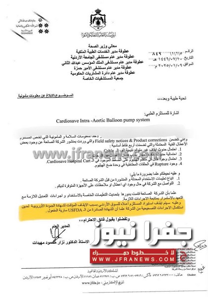 وبحسب كتاب صادر عن مؤسسة الغذاء والدواء وصل "جفرا نيوز" نسخة منه، فإن ذات المستلزم الطبي قررت المؤسسة إيقاف استيراده إلى السوق الأردني، بسبب الإيقاف المؤقت لشهادة الجودة الأوروبية .