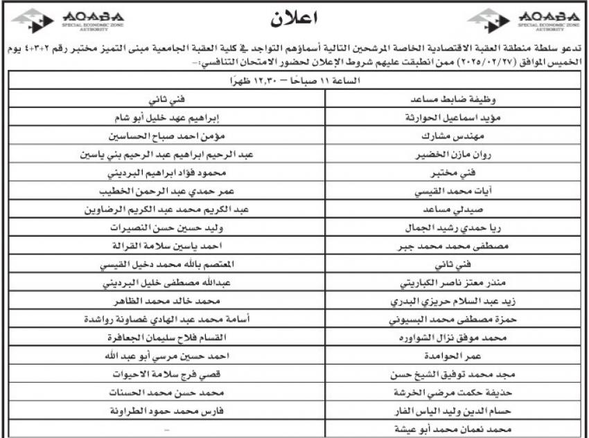 دعت المؤسسة العامة للغذاء والدواء وسلطة منطقة العقبة الاقتصادية الخاصة، بالتنسيق مع إدارة تقييم الكفايات الوظيفية/ هيئة الخدمة والادارة العامة ، المرشحين التالية اسماؤهم لغايات اجراء المقابلة الشخصية والامتحان التنافسي الالكتروني .