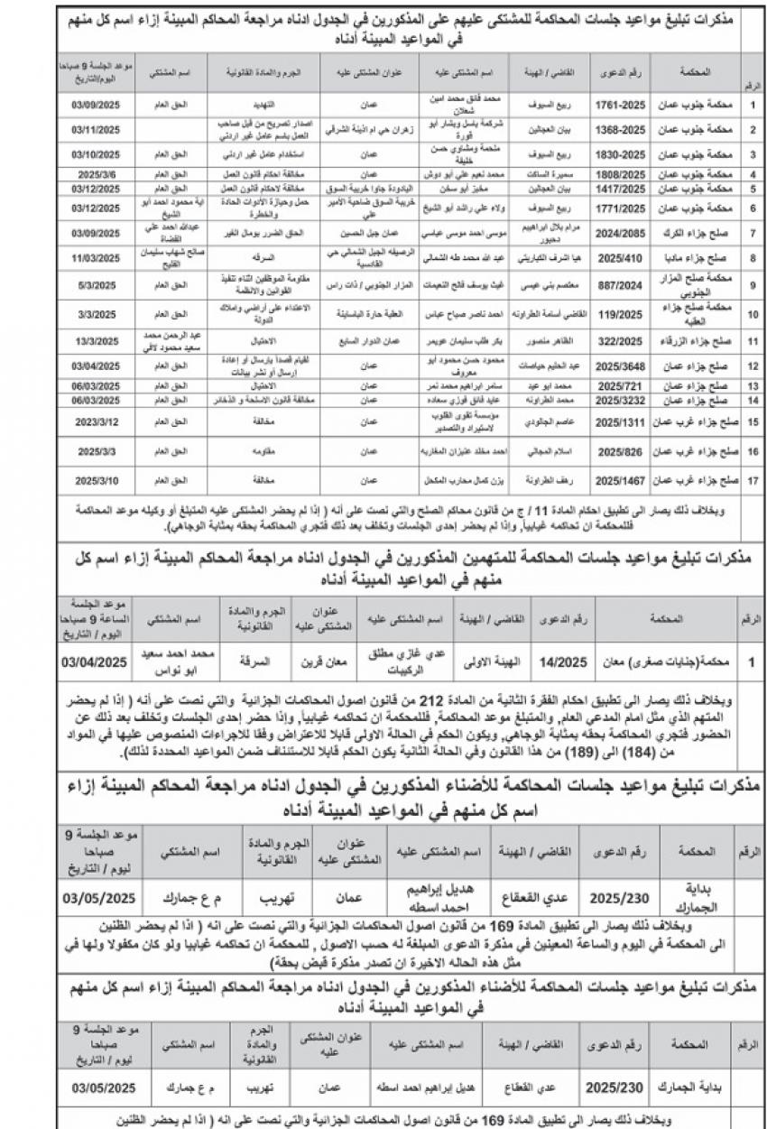 صدرت اليوم الاثنين، مذكرات تبليغ مواعيد جلسات المحاكمة لمشتكى عليهم ولمتهمين وقرارات امهال لحضور جلسات محاكمة.