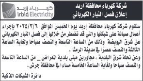أعلنت شركة كهرباء إربد عن نيتها لفصل التيار الكهربائي عن منطقة شرق البويضة في الرمثا لغايات أعمال الصيانة يوم الخميس القادم 6/3/2025.