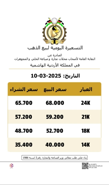 وبلغ سعر بيع الغرام الواحد من الذهب عيارات 24 و18 و14 لغايات الشراء من محالّ الصاغة 68 و52.7 دينارا و40 دينارا على التوالي.