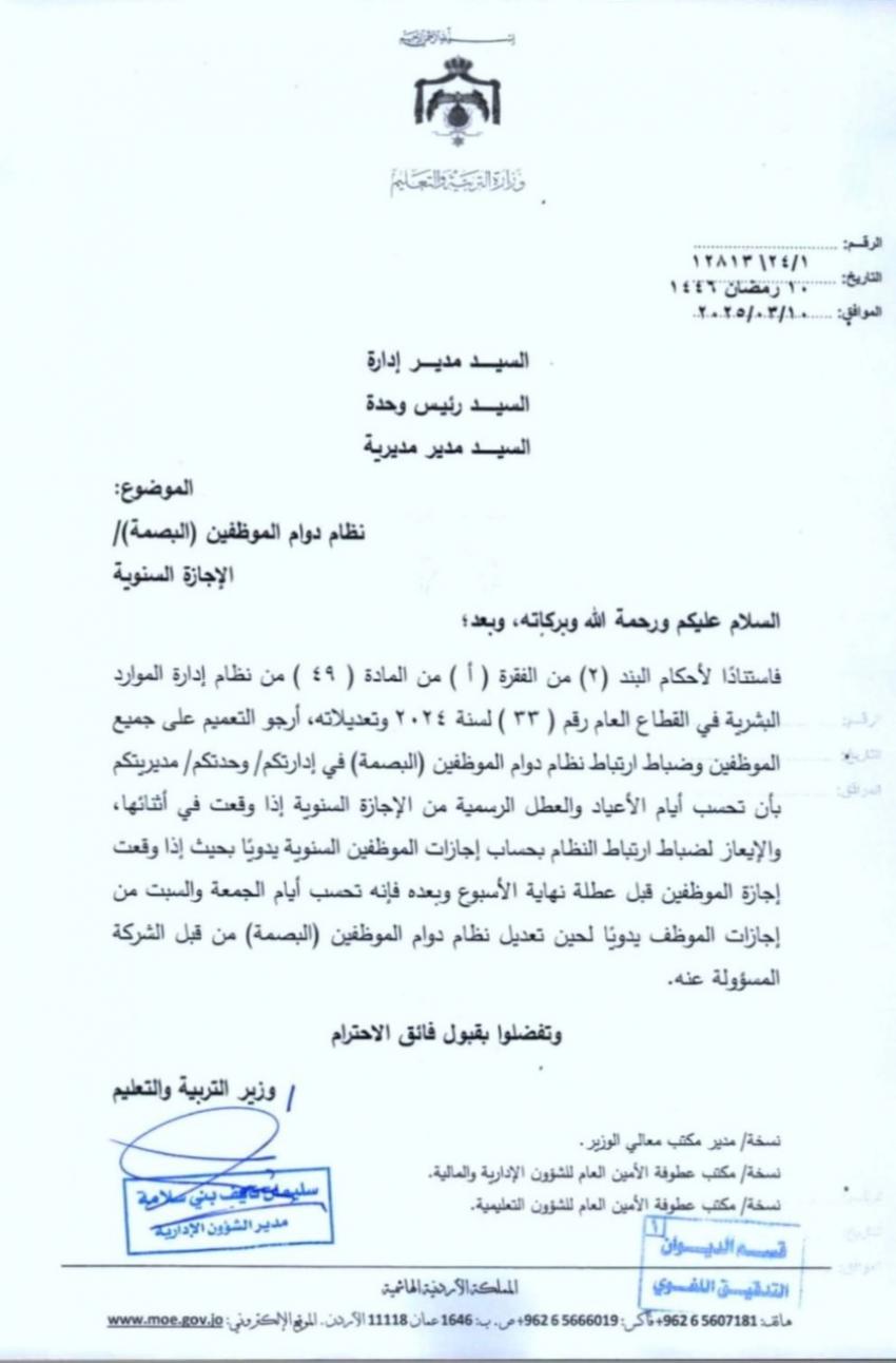 وبحسب الكتاب على ضباط ارتباط الدوام حساب اجازات الموظفين السنوية يدويا بحيث اذا وقعت اجازة الموظف قبل عطلة نهاية الاسبوع وبعده فانه تحسب ايام الجمعة والسبت من إجازات الموظف يدويا لحين تعديل نظام "البصمة " .
