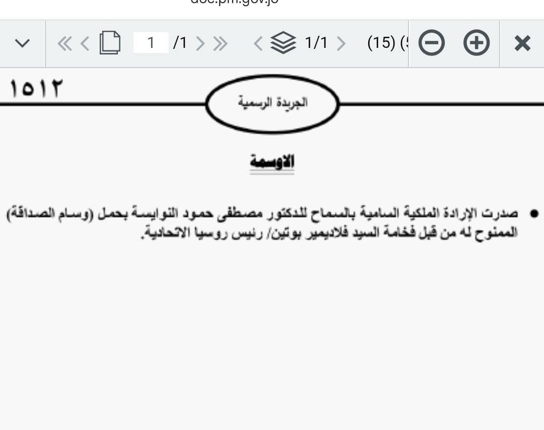 صدرت الإرادة الملكية السامية، في عدد الجريدة الرسمية اليوم الأحد، بالسماح للدكتور مصطفى حمود النوايسة، بحمل "وسام الصداقة"، الممنوح له من الرئيس الروسي فلاديمير بوتين.