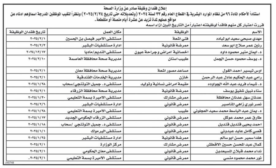 فاقدون لوظائفهم في وزارة الصحة (أسماء)